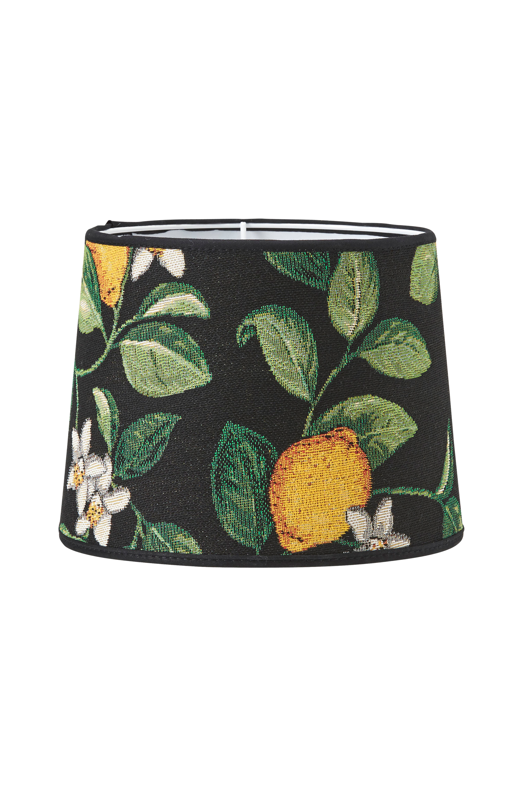 Skärm Sofia i vackert jaquardvävt tyg. Skärmen har en ljus insida och levereras med E27 ringfäste. Höjd 15,5 cm. Diameter nertill 20 cm, upptill 17 cm.